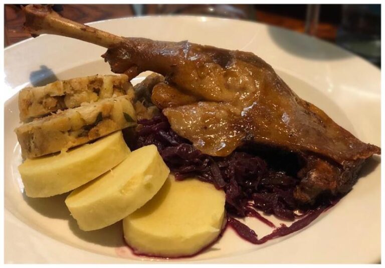 Pečené husí stehno, červené zelí s jablky, skořice, bramborové noky, lokše a karlovarský knedlík